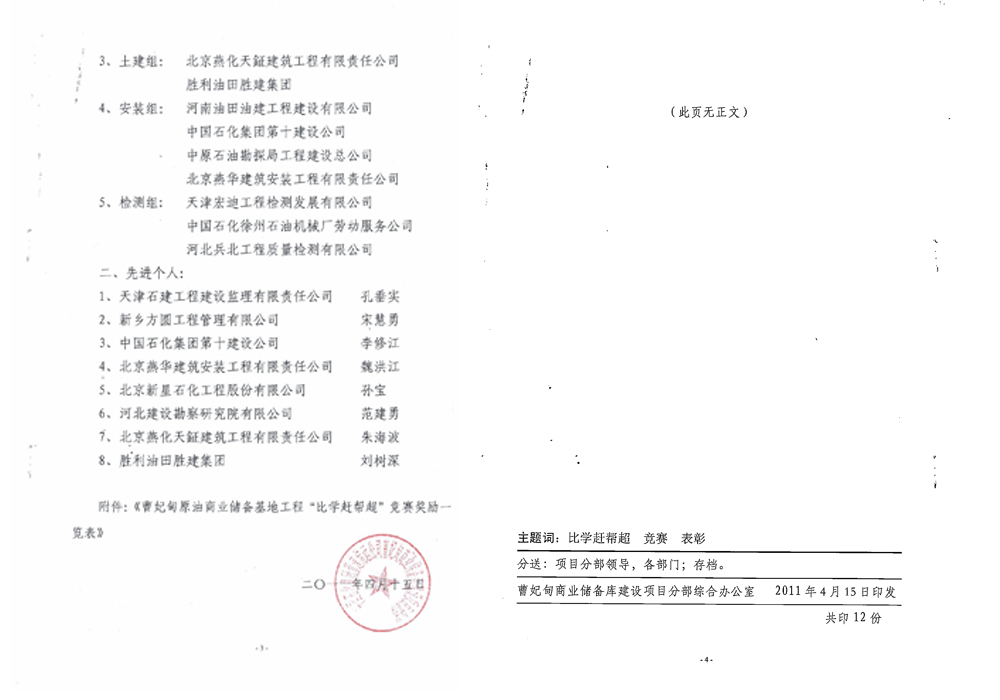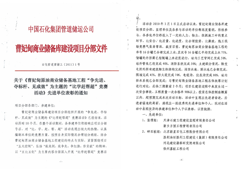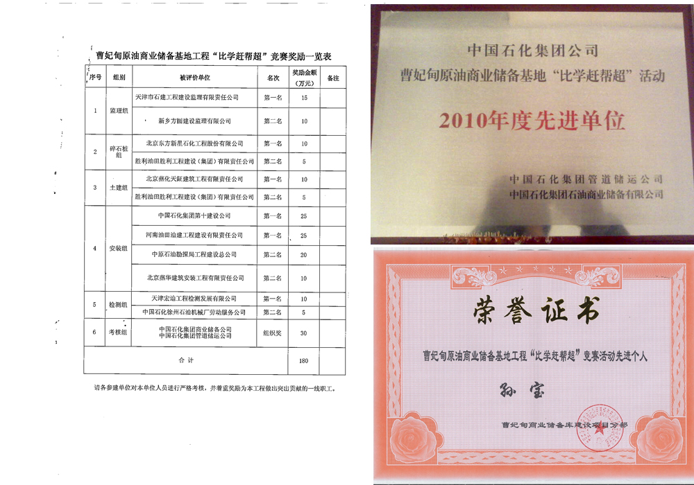 在曹妃甸原油商业储备基地工程“比学赶超帮”竞赛中,获2010年度先进单位