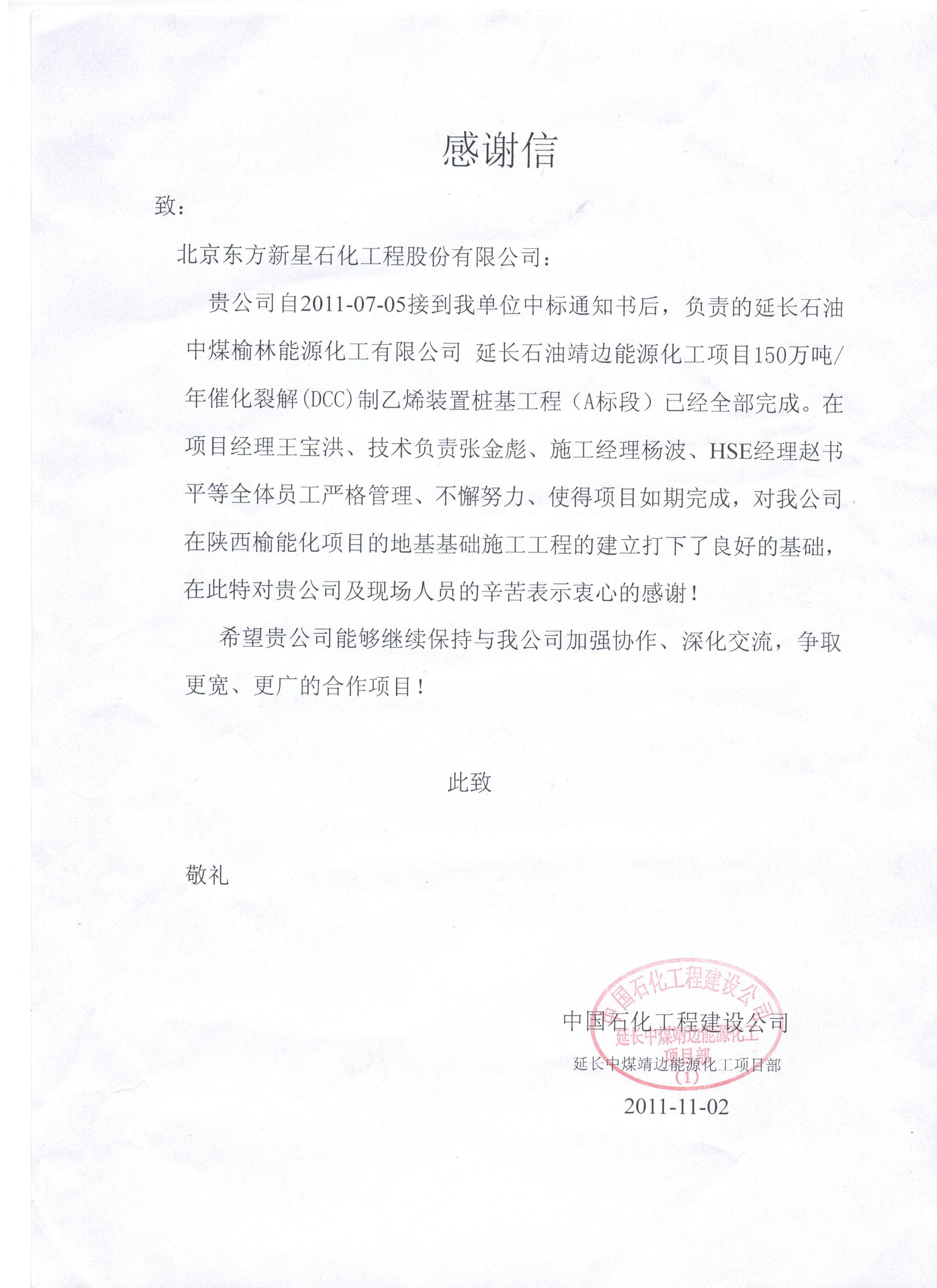 中国石化工程建设公司延长中煤靖边能源化工项目部发来的感谢信
