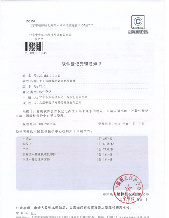 喜讯二——公司本月初申报的软件著作权“土工试验数据处理系统软件”(张忠良)及实用新型专利“静载试验锚桩锁固装置”(朱文久)申请,近日分别被中国版权保护中心及国家知识产权局登记受理。